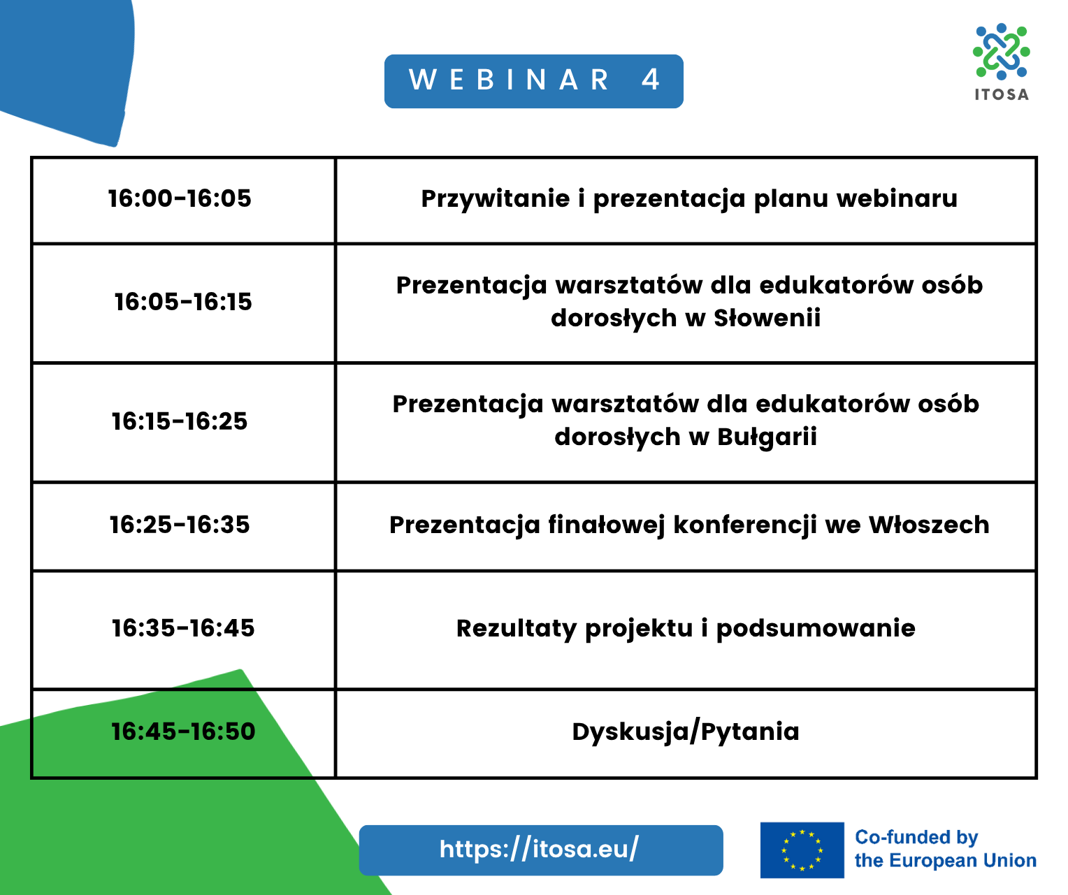 Ze względu na międzynarodowy charakter projektu ITOSA – Innowacyjne Metody Aktywizacji Seniorów webinar prowadzony będzie w języku angielskim.