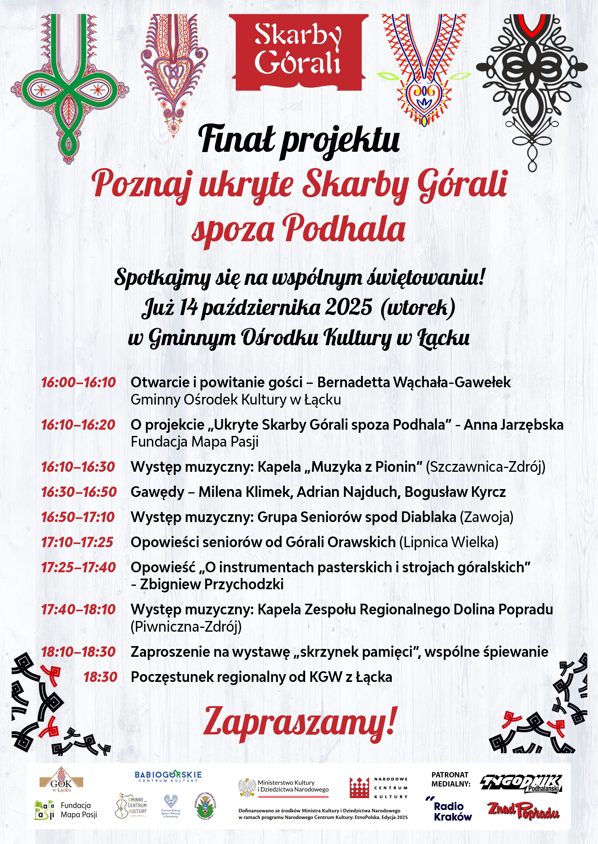 14 października 2025 roku o godz. 16:00 w Gminnym Ośrodku Kultury w Łącku odbędzie się finał projektu „Ukryte Skarby Górali spoza Podhala”. To wyjątkowa okazja, by wspólnie świętować bogactwo kultury góralskiej – tej mniej znanej, ale równie barwnej i pięknej.